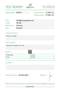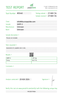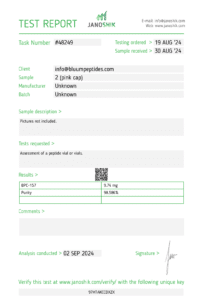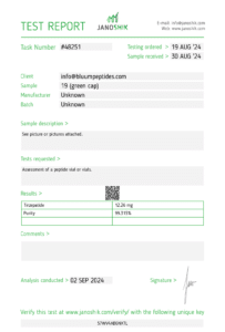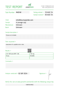Peak Peptides provides detailed and accurate lab results, showcasing the quality and integrity of our bioactive peptide production processes.
