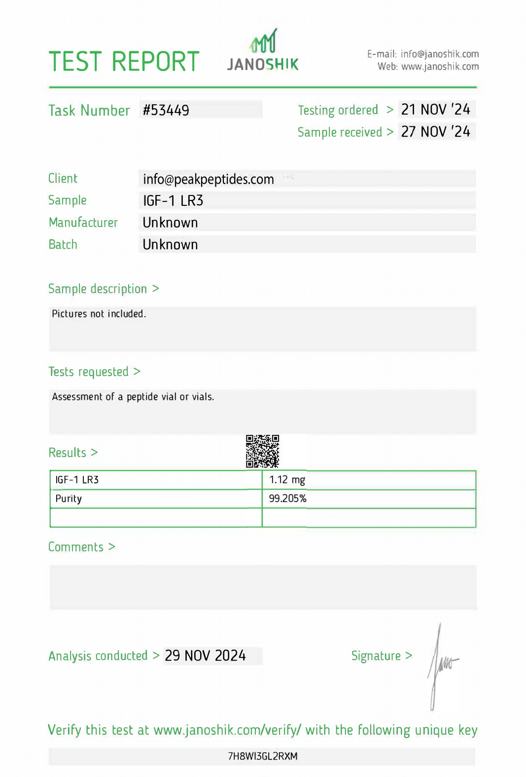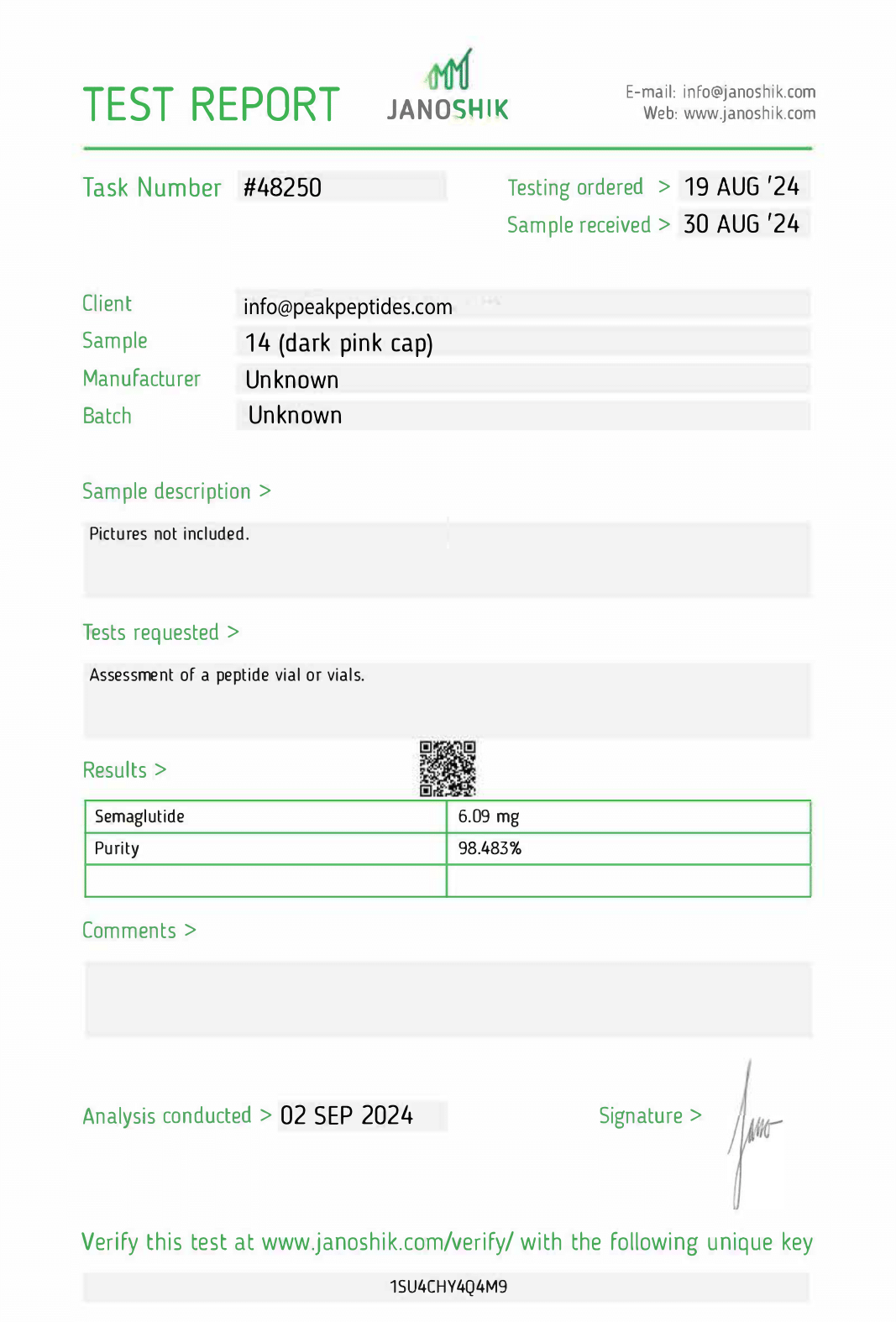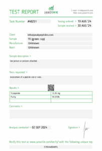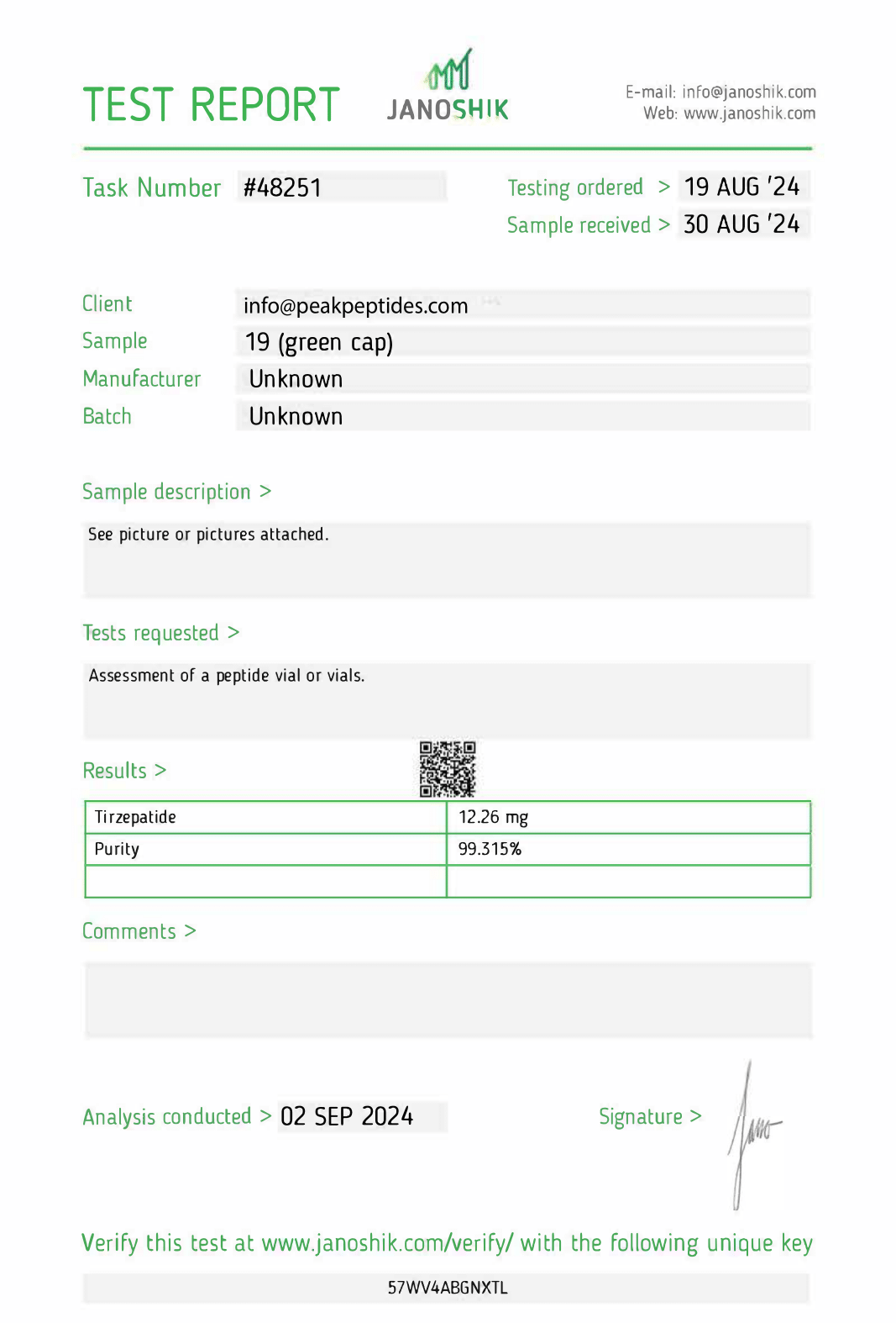 At Peak Peptides, we prioritize your product confidence by adhering to industry-leading testing standards. Every product undergoes a thorough analysis in ISO/IEC 17025-certified laboratories to ensure compliance with global safety and quality guidelines.
